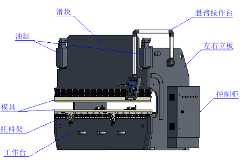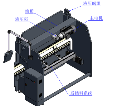 電液伺服液壓折彎機(jī)主要由床身、控制系統(tǒng)、液壓系統(tǒng)、后擋料系統(tǒng)、模具及補(bǔ)償機(jī)構(gòu)等部分組成,運(yùn)動(dòng)方式為上動(dòng)式(液壓驅(qū)動(dòng)系統(tǒng)在上面,驅(qū)動(dòng)滑塊上下運(yùn)動(dòng),工作臺(tái)不動(dòng)),其結(jié)構(gòu)復(fù)雜、精度高,設(shè)備安全方面采用了雙重保護(hù)。