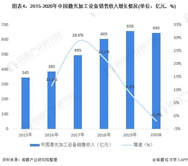 中國(guó)激光加工設(shè)備銷(xiāo)售收入約為全球的一半,2015-2020年中國(guó)激光加工設(shè)備銷(xiāo)售收入持續(xù)增長(zhǎng),2019年達(dá)658億元,2020年初步估計(jì)達(dá)到645億元。