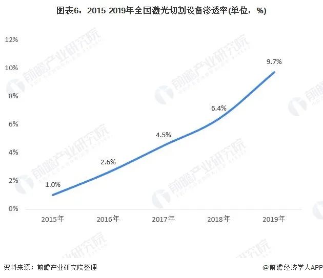 相對(duì)于國(guó)際激光設(shè)備制造與應(yīng)用,我國(guó)激光切割設(shè)備滲透率較低,歐美發(fā)達(dá)國(guó)家已經(jīng)步入“光加工”時(shí)代,我國(guó)激光加工設(shè)備應(yīng)用滲透率相對(duì)國(guó)際水平較低,2019年我國(guó)激光切割設(shè)備銷(xiāo)量?jī)H為金屬削機(jī)床銷(xiāo)量的9.7%,不到10%,占比較低。