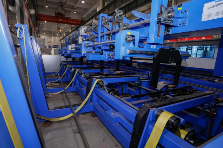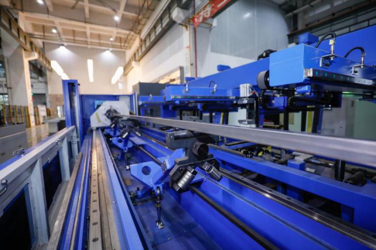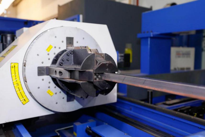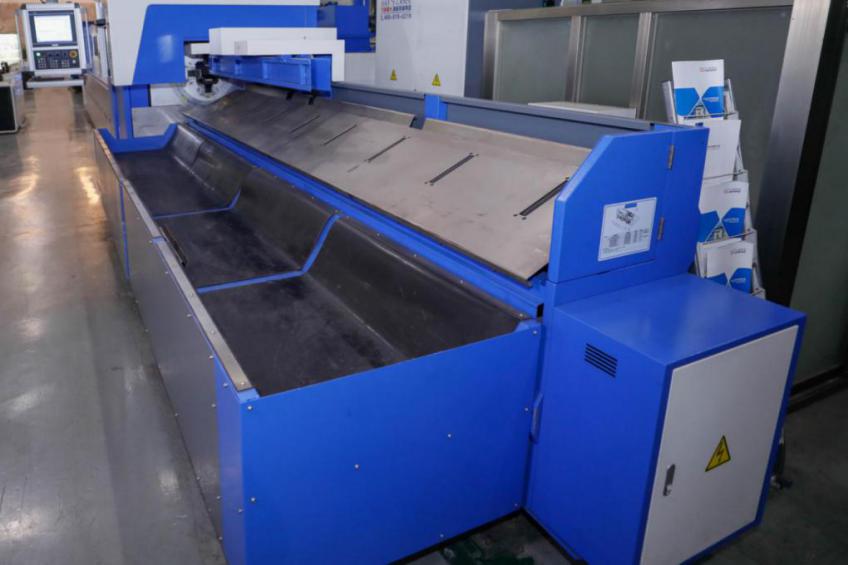 改進(jìn)后的夾持系統(tǒng),由兩組滑板、數(shù)控旋轉(zhuǎn)臺和四爪對抓自定心氣動夾頭組成,其中一組移動(X軸),另一組固定在床身上。通過大族智控數(shù)控系統(tǒng)控制交流伺服電機驅(qū)動送料夾頭,實現(xiàn)X軸方向的快速移動和送料,完成上料、切割送料。四爪自定心對抓氣動夾頭采用氣動夾緊。兩個夾爪聯(lián)動,實現(xiàn)自定心功能;兩對對抓卡爪單獨運動,實現(xiàn)對不同形狀管材的自定心夾緊。改進(jìn)后的夾緊氣缸不再隨夾頭旋轉(zhuǎn),無密封漏氣風(fēng)險,最大夾緊重量提高到200公斤,夾緊后有反饋信號,且可以自動檢測管材規(guī)格,并與程序進(jìn)行比較,判斷是否上錯管材,實現(xiàn)對不同長度,不同形狀管材的定位、夾緊和比對。
