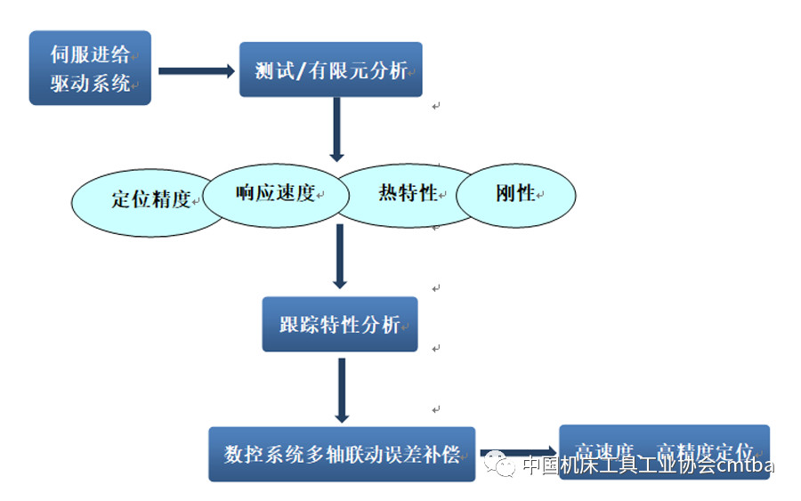 對電機(jī)及伺服進(jìn)給驅(qū)動系統(tǒng)進(jìn)行測試及有限元分析,結(jié)合定位精度、響應(yīng)速度、熱特性、電機(jī)剛性進(jìn)行分析及優(yōu)化,并跟蹤特性分析,對數(shù)控系統(tǒng)多軸聯(lián)動進(jìn)行誤差補(bǔ)償,獲得高速度,高精度定位。伺服驅(qū)動系統(tǒng)分析方框圖如圖5所示。