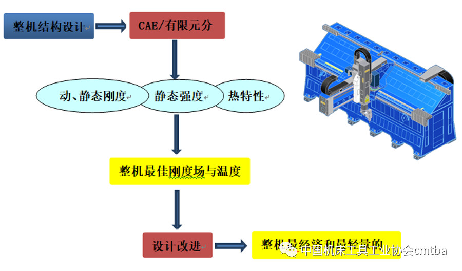 對整機(jī)結(jié)構(gòu)進(jìn)行CAE有限元分析,結(jié)合動、靜態(tài)剛度,靜態(tài)強(qiáng)度,熱特性進(jìn)行分析,得到整機(jī)最佳的剛度場與溫度場,經(jīng)過反復(fù)測試及驗證,進(jìn)行設(shè)計改進(jìn),分析理論值與實際測試值數(shù)據(jù)的差異化的因素,當(dāng)理論值與實際測試值數(shù)據(jù)基本吻合,最終獲得整機(jī)既經(jīng)濟(jì)又輕量的結(jié)構(gòu)設(shè)計。機(jī)床結(jié)構(gòu)優(yōu)化設(shè)計及動態(tài)設(shè)計方框圖與機(jī)床結(jié)構(gòu)圖如圖2所示。