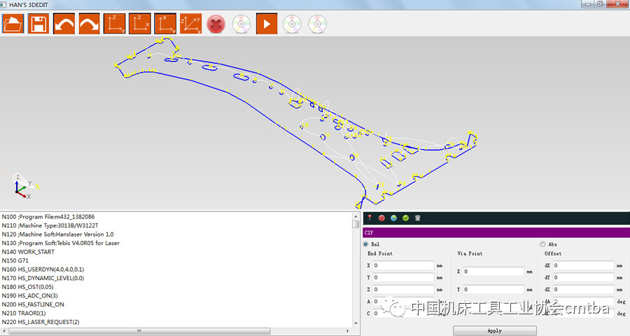 (2)研究RTCP功能數(shù)據(jù)。三維五軸光纖激光切割系統(tǒng)由三大功能塊組成,分別是加工控制模塊、離線編程模塊以及激光切割工藝數(shù)據(jù)庫。結(jié)合加工裝備的硬件集成,面向三維五軸光纖激光切割工藝的軟件二次開發(fā),給予PC工控平臺設(shè)計數(shù)控系統(tǒng)控制類函數(shù),開發(fā)三維五軸光纖激光切割控制應(yīng)用程序接口,實現(xiàn)三維五軸光纖激光切割機(jī)床運(yùn)動控制以及工藝調(diào)節(jié)等功能。