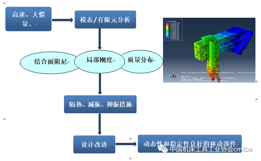 對高速度、大慣量、大尺寸的部件進(jìn)行CAE有限元模態(tài)分析,對結(jié)合面阻尼、局部剛度、質(zhì)量分布進(jìn)行分析,采取隔振、減振、抑振措施,對結(jié)構(gòu)進(jìn)行設(shè)計改進(jìn)及優(yōu)化,經(jīng)過反復(fù)測試驗證,獲取動態(tài)性能和穩(wěn)定性良好的移動部件,確保產(chǎn)品的動態(tài)性能與穩(wěn)定性。提高動態(tài)性能和穩(wěn)定性方框圖與模態(tài)分析圖分別如圖3 、圖4所示。