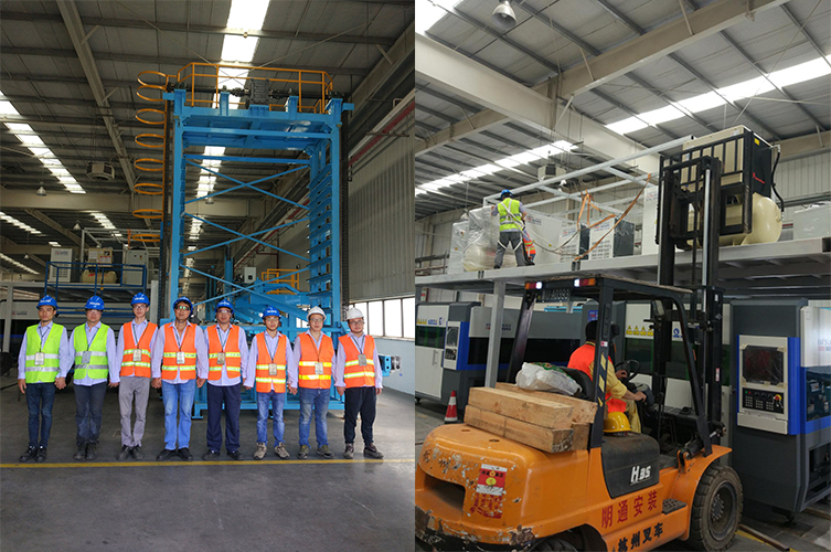 項目的安裝過程困難重重,由于客戶提供給研發(fā)的尺寸有誤,產(chǎn)線料庫立起以后料庫梯子被車間管道擋住無法上人,我方工程師決定要把梯子改造到別外一邊,重新配孔,切割梯子和料庫頂上護欄進出口現(xiàn)場切割和焊接比較困難,又加上是高空作業(yè),導(dǎo)致整個安裝過程真是難上加難。我方項目負責工程師劉春華、何亮、李付清、趙爽、胡科、王曉烽、胡智明、宴嘉、張道慶在重重的困難面前,嚴格根據(jù)要求一絲不茍的完成安裝工作,用自己的專業(yè)技術(shù)解決了標準機防塵罩變徑接頭尺寸不對、產(chǎn)線護欄現(xiàn)場組裝等問題。