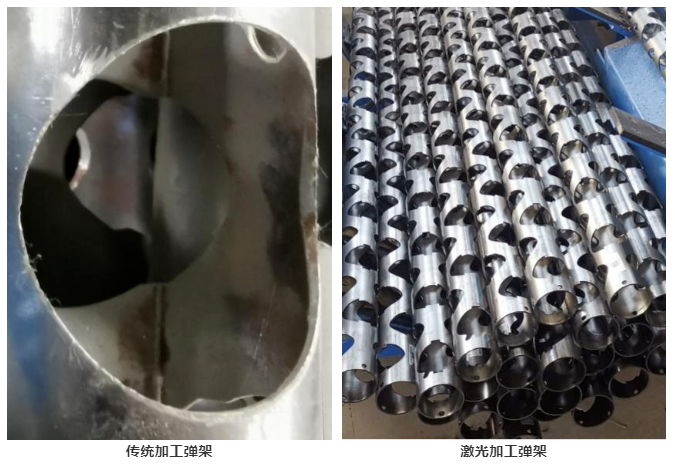 通過對激光器功率、氣流、系統(tǒng)及NC程序優(yōu)化,生產(chǎn)線實(shí)現(xiàn)對彈架高效率、高質(zhì)量斷面切割及嚴(yán)格的毛刺和掛渣控制。