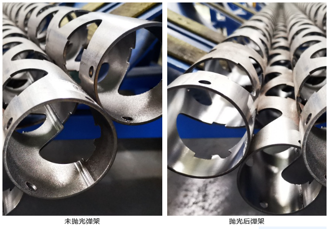 內(nèi)壁自動(dòng)處理系統(tǒng)對彈架進(jìn)行自動(dòng)分料、上料、內(nèi)壁自動(dòng)拋光、自動(dòng)下料,拋光后內(nèi)壁潔凈。