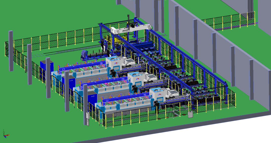 激光切管柔性生產(chǎn)線(切管FMS)將庫房至激光加工車間之間建立一條自動(dòng)傳輸線,實(shí)現(xiàn)成捆原材料及成品往返傳輸。