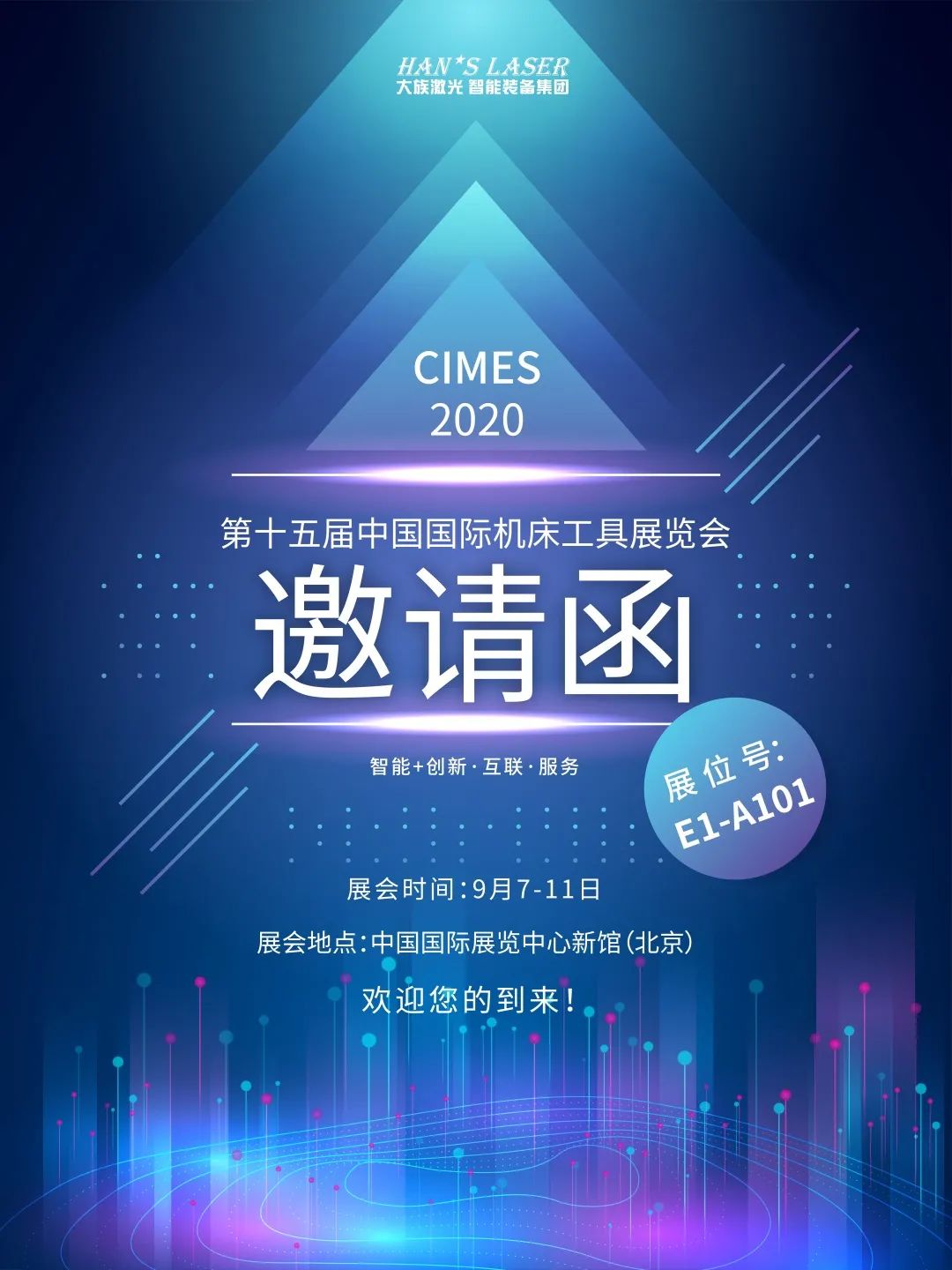 第十五屆中國國際機床工具展覽會,將于2020年9月7-11日在中國國際展覽中心新館(北京)舉行,大族激光智能裝備集團攜激光智能制造系統(tǒng)解決方案亮相,展位號E1-A101,期待您的蒞臨參觀!