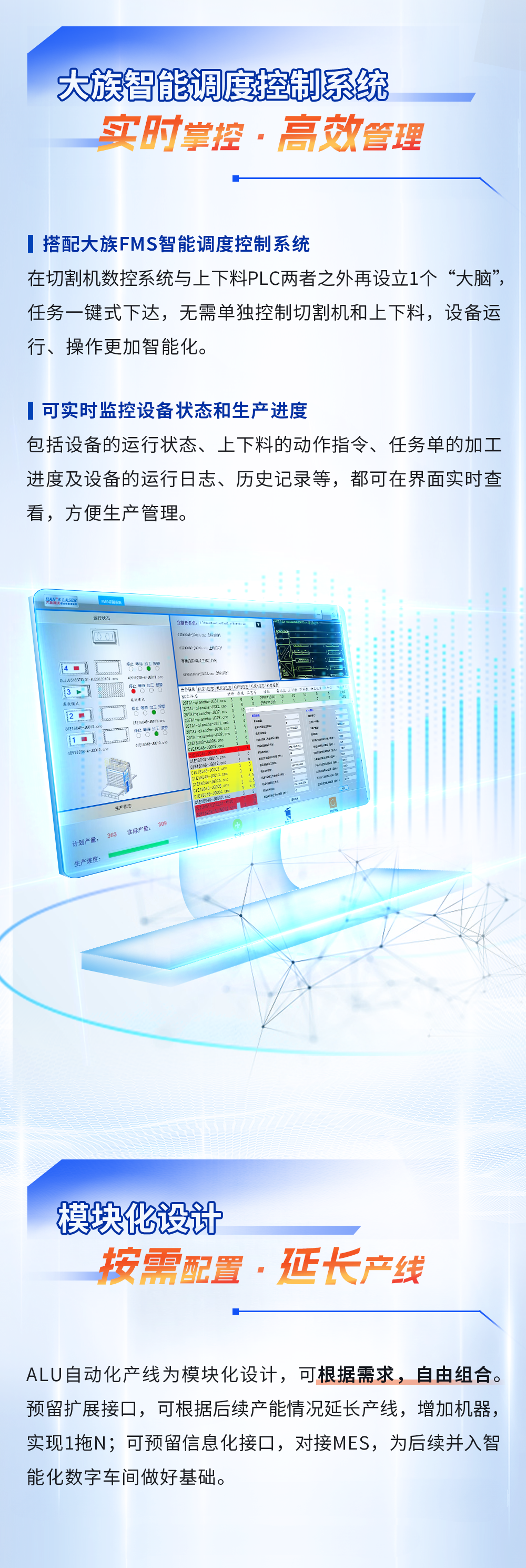 全新結(jié)構(gòu)的ALU系列自動(dòng)化切割生產(chǎn)線,協(xié)調(diào)性更高、效率更高,模塊化設(shè)計(jì),可根據(jù)需求自由組合,預(yù)留擴(kuò)展接口,可根據(jù)后續(xù)實(shí)際產(chǎn)能情況增加機(jī)器,實(shí)現(xiàn)1拖N,并可預(yù)留信息化接口,對(duì)接MES,為后續(xù)并入智能化數(shù)字車間做好基礎(chǔ)。
