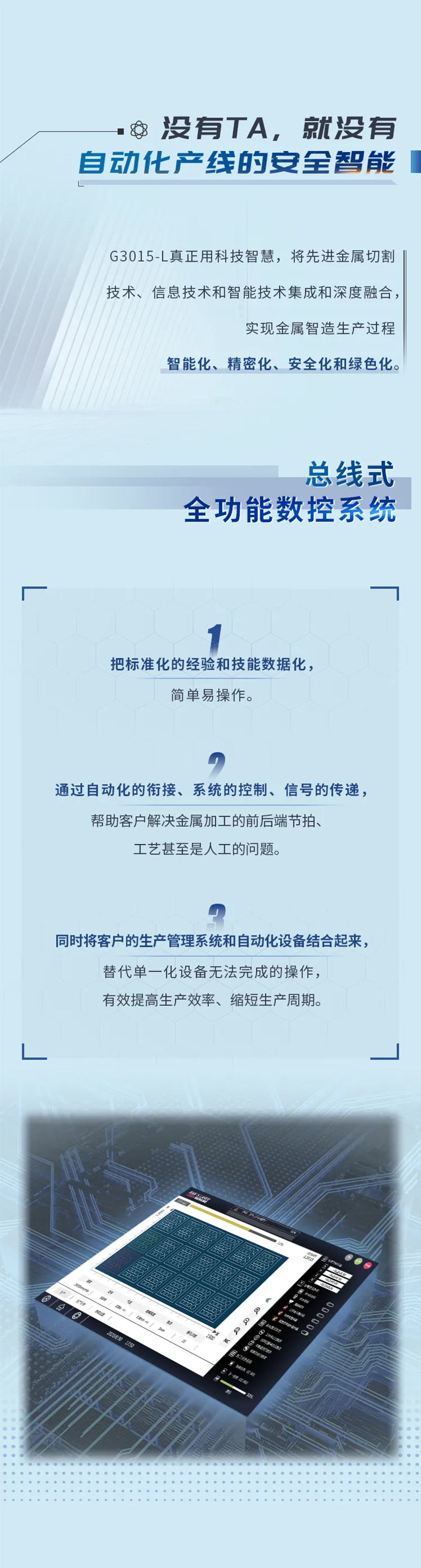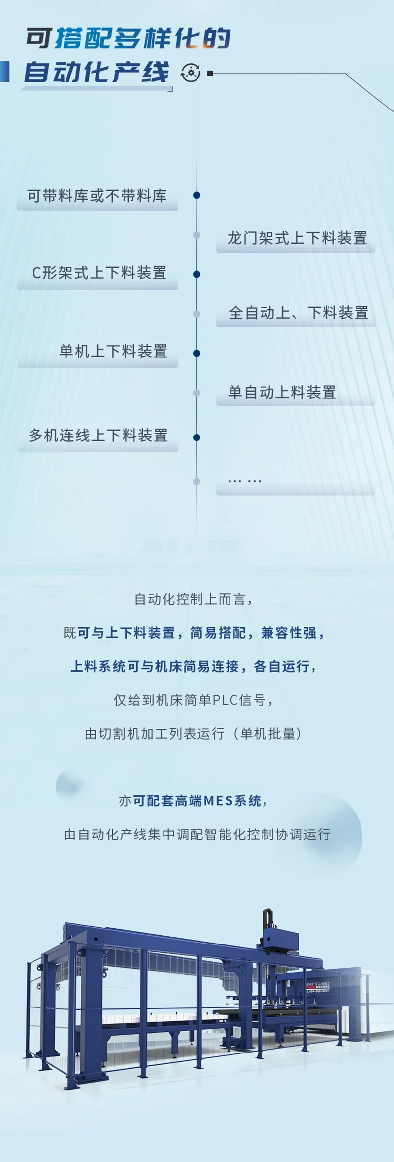 全新結(jié)構(gòu)的ALU系列自動(dòng)化切割生產(chǎn)線,協(xié)調(diào)性更高、效率更高,模塊化設(shè)計(jì),可根據(jù)需求自由組合,預(yù)留擴(kuò)展接口,可根據(jù)后續(xù)實(shí)際產(chǎn)能情況增加機(jī)器,實(shí)現(xiàn)1拖N,并可預(yù)留信息化接口,對(duì)接MES,為后續(xù)并入智能化數(shù)字車間做好基礎(chǔ)。